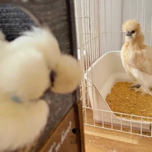 烏骨鶏の魅力は、白いフサフサ羽にブルーのお耳。サランと姫。多分、姉妹。。。